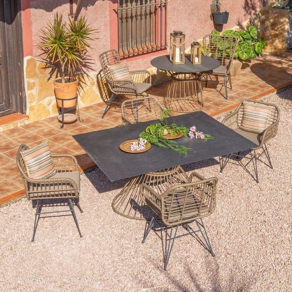 456,46 €Tipo: Tavolo Tavolo da Pranzo Materiale: Acciaio rattan sintetico Vetro Temperato Dimensioni appross.: 150 x 120 x 71,5 cm Uso consigliato: Esterno Peso (kg) 35,000